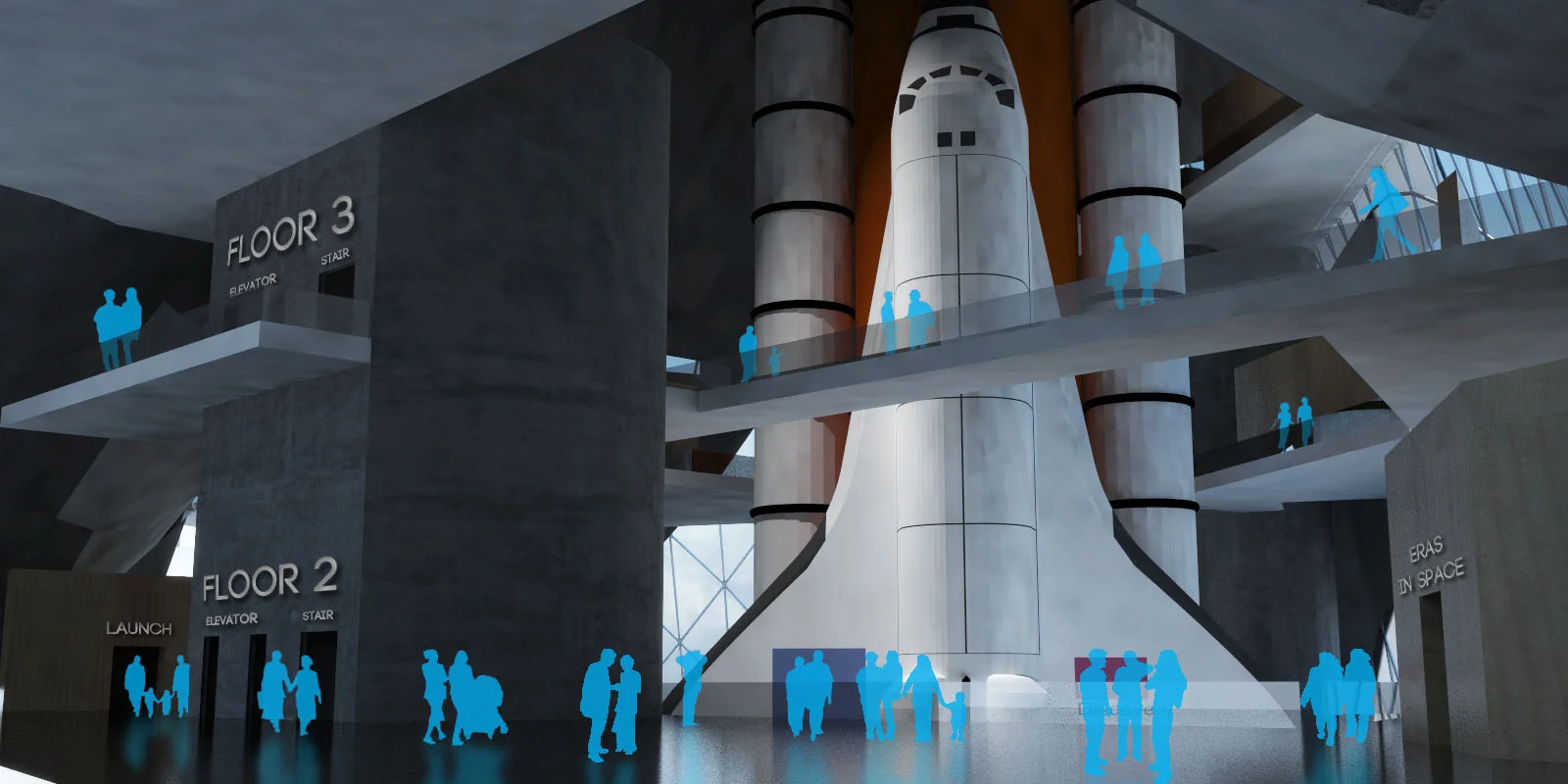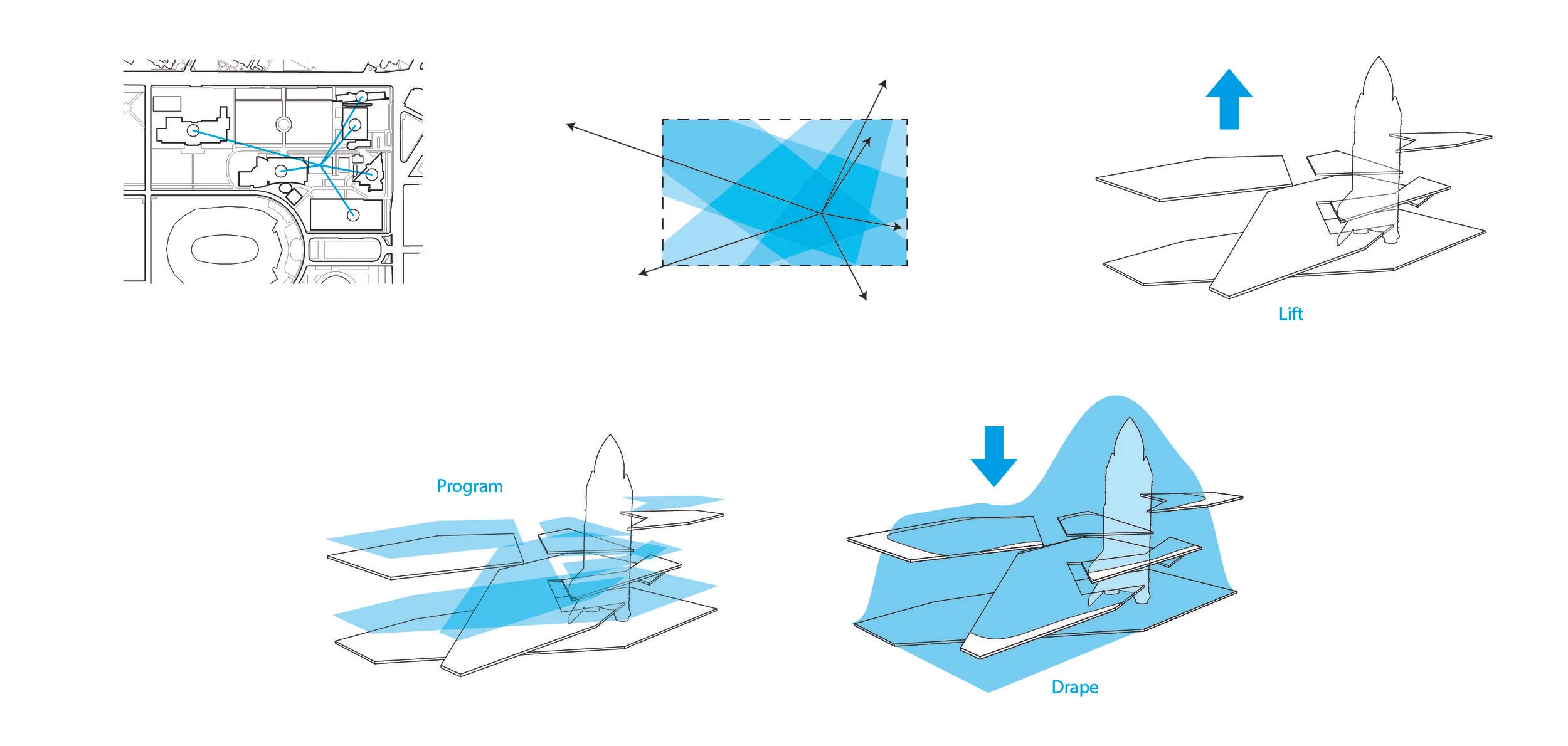 The Endeavour exhibit is an opportunity for the California Science Center. Endeavour will be the only shuttle, of the five publicly displayed, on the West Coast. In Los Angeles the shuttle is exposed to a large range of people, from tourists to one of the 15 million residents. This influx of people could also benefit the surrounding museums but that will require the building both highlight the Endeavour while creating a strong connection with its context. Connections are made through designed viewpoints, formed through manipulations of elevations and distances, that focusing on significant areas of the shuttle. The museum is connected to the site by relating the form and program of different floors to different buildings in Exposition Park. Showing this the cockpit is part of the Human Systems exhibit and floor plate’s direction and orientation relates to the African American Museum, incorporating everything through both form and function.