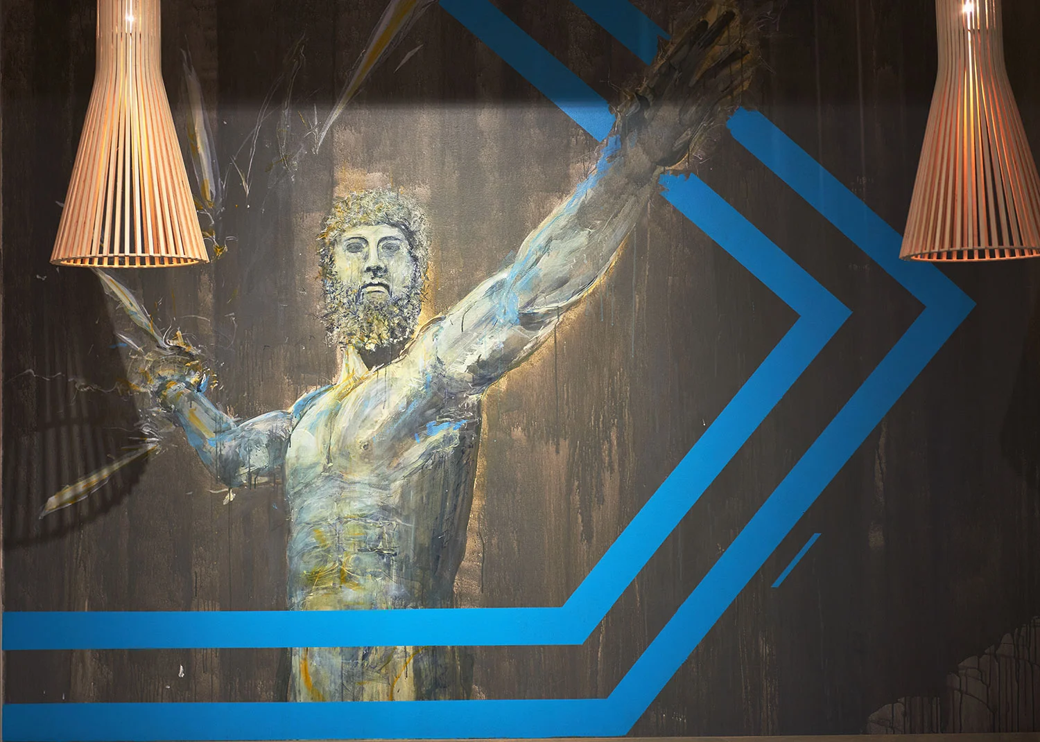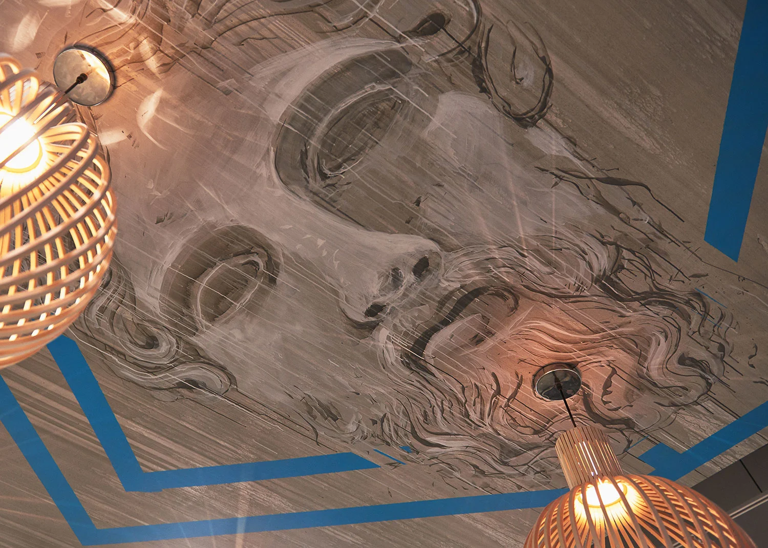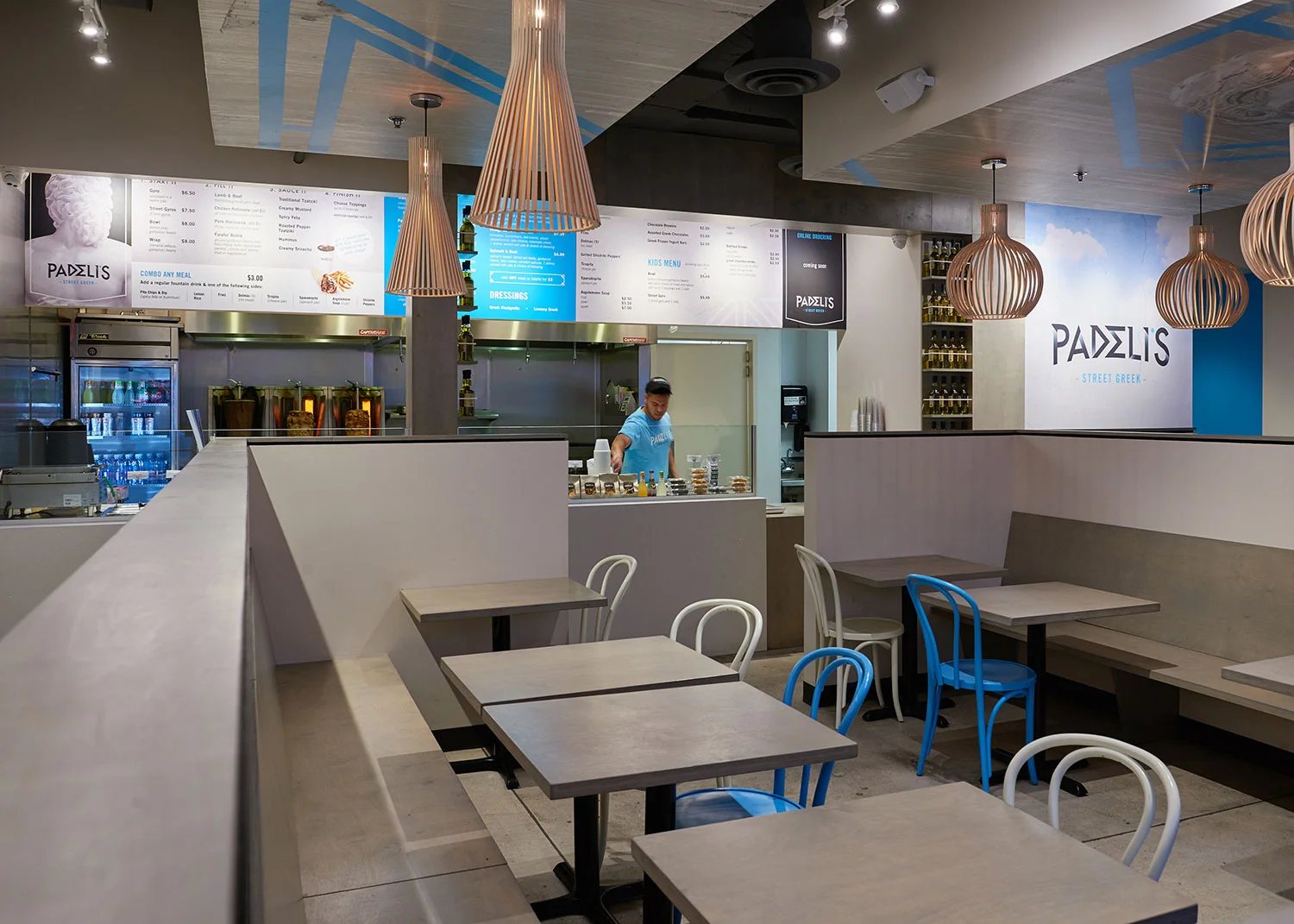 Padelis is a fast casual restaurant making food straight from the streets of Greece, driven by the downtown lunch rush. We wanted to showcased the fact that the food is made right when you order it. All the ingredients and even rotisserie spits are visible to the customer as they walk through the queue. The dining area references the tradition colors of Greece with a twist, using a cream white and electric blue. The use of distressed and gray stained wood creates a weather look for the tables and benches. To give it that street greek feel, one of WOW partners, Ben Wiemeyer a graffiti artist, paint a number of the greek god graphics throughout the space. The space was designed in collaboration with Dinng, a design and branding studio, who designed the menus and graphics for the space.