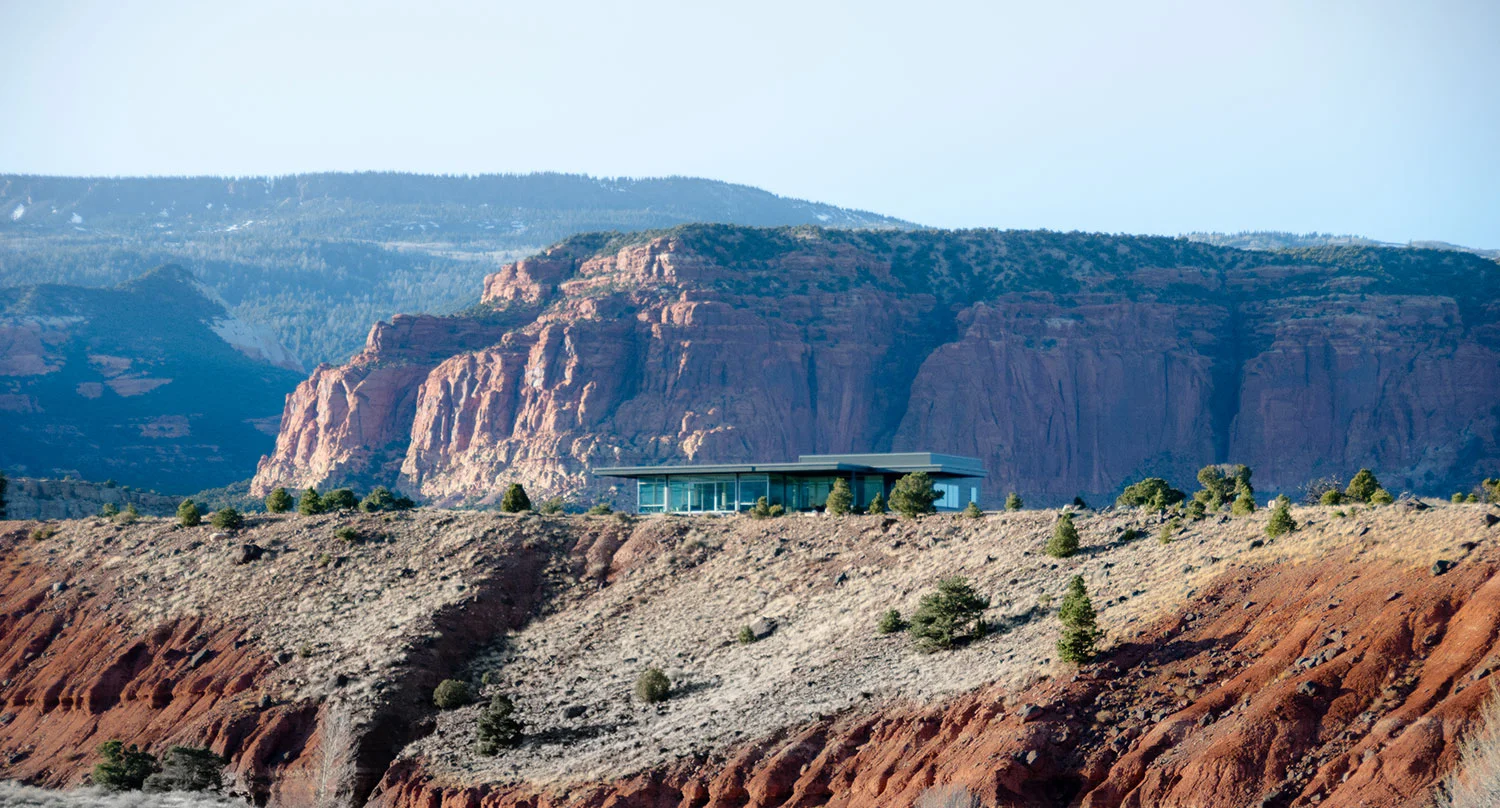 The Sleeping Rainbow Residence is located just outside of Utah’s Capitol Reef National Park. It is a simple open floor plan focused on framing the view of the surrounding mountains. Namingly Sleeping Rainbow, a geological feature known as one of the prettiest landforms on the Colorado Plateau. It rises up to 3,000 feet, exposing an incredible array of multicolored sandstone and limestone layers. The building uses a muted palette of light grays, seen in the corrugated steel siding and aluminum windows frames, to contrast with the vibrate colors of the red soil and array of wildflowers in the area.