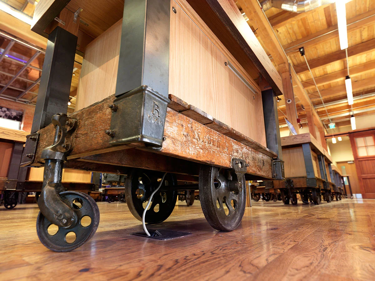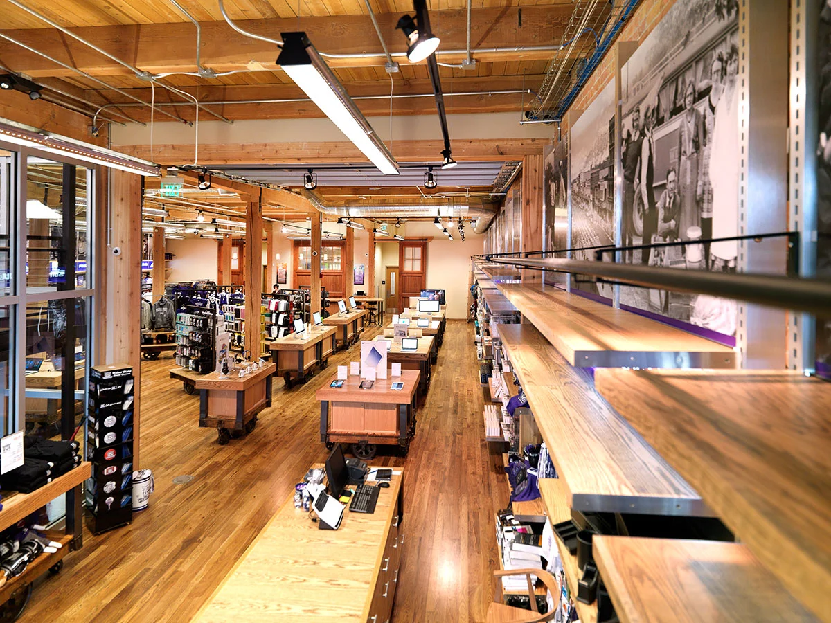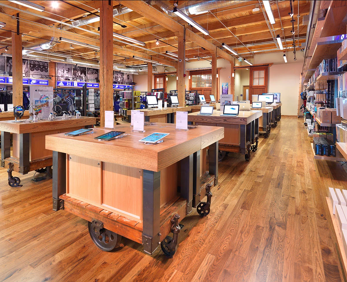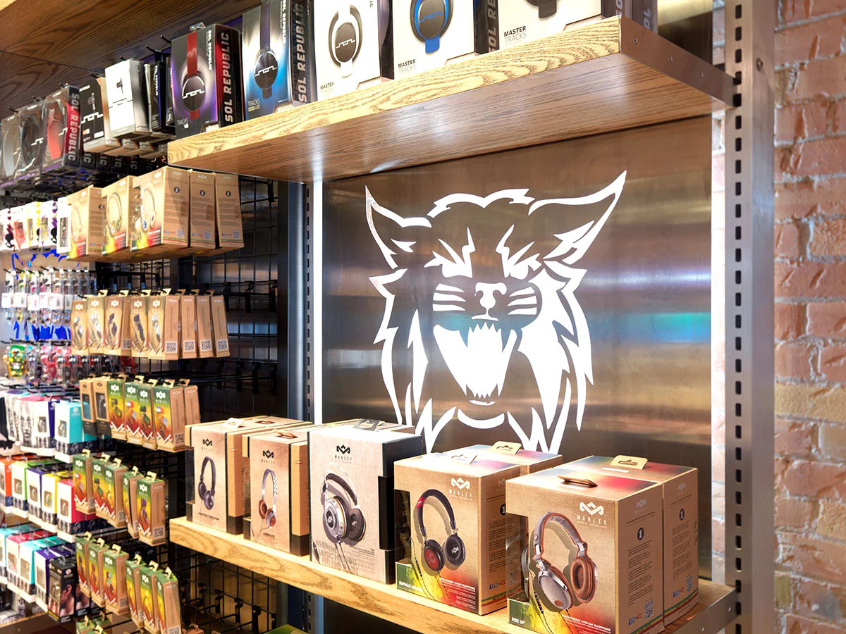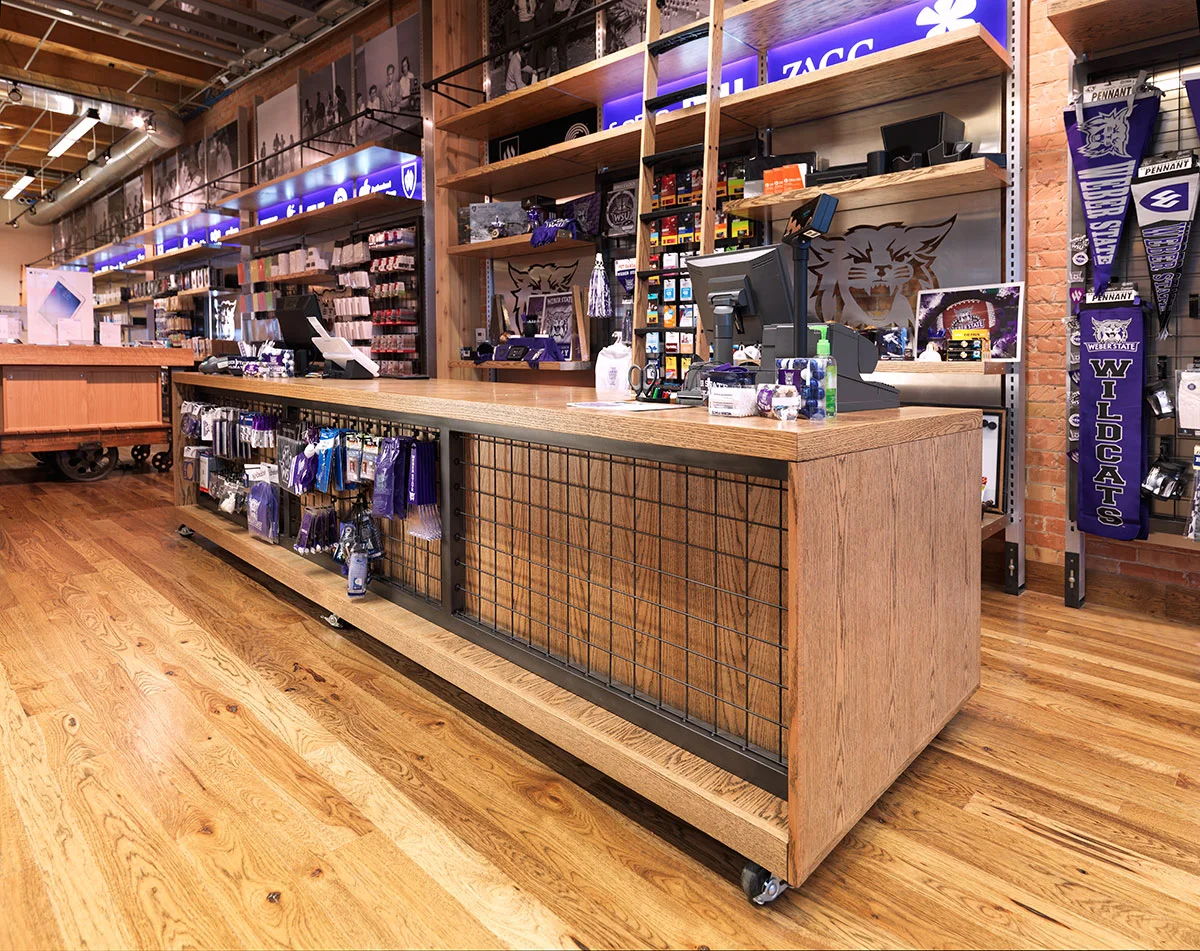 The Wildcat Store is a satellite campus store for Weber State University located in a historic storefront in downtown Ogden. Diamond Phillips was commissioned to provide interiors, furniture, displays, and branding for the Apple Store, cafe, and university retail areas. Our design goal was to join the spirit of WSU to downtown Ogden while also using Ogden’s history to create a contemporary platform for new technology and Weber State’s future. The design constantly refers to the history of the building and the region, through the layout, material usage, and furniture choices. The design showcased what makes the building unique by exposing the brick of the original structure and cleaning up the wood frame of the building's original structure. To build a sense of place throughout the building, there are historic photos from WSU’s archive designed into the merchandise display racks. The merchandise tables and Apple store displays are constructed from antique railroad carts which had been restored and retrofitted to meet Apple’s strict requirements while still showing their original character. They act as a way to integrate clean modern design while showing Ogden’s roots as a railroad city.